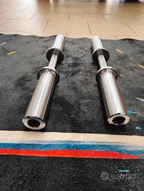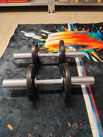 Vendo coppia di manubri olimpici di lunghezza 50 cm, dal peso di 3,5 kg cadauno, in ottime condizioni e usati pochissimo. Costruiti come dei piccoli bilancieri, in modo da poter usare gli stessi dischi dei bilancieri olimpici grazie al foro da 50 mm. Impugnatura (diametro 25 mm) zigrinata antiscivolo lunga 15 cm, per una presa comoda e sicura durante l'esercizio. Realizzati in acciaio cromato resistenti ad acqua, sole e sudore. Carico massimo 100 kg ciascuno. Molto versatili e ottimi per home gym. Dischi in foto non inclusi. Non spedisco, solo ritiro a mano.