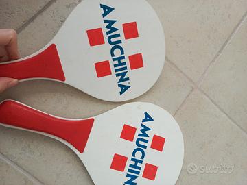 Coppia di racchette bianche con manico rosso e logo AMUCHINA. - Design con quadrati rossi. - Manici rossi. - Logo AMUCHINA blu.