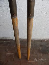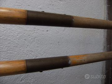 Coppia di remi realizzati in legno negli anni '60 con protezione centrale per scalmo in ottone, lunghezza remo 161 cm. diametro 3.5 cm. circa, dimensione pala 45x11 cm. Necessitano di una riverniciatura. Solo ritiro in zona, non spedisco.