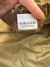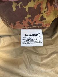 Copri sacco a forma trapezoidale con angoli arrotondati, costituito da due teli uniti con due cuciture longitudinali, di tessuto in poliammide impermeabile-traspirante Advanta® a 3 strati, 190gr/m² in colore policromo vegetato