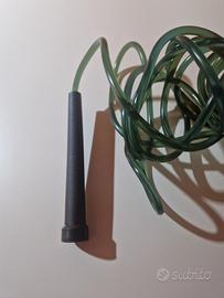 Vendo corda per saltare ideale per allenamento cardio, fitness, boxe o riscaldamento generico. Lo strumento è leggero e resistente, perfetto sia per principianti che per atleti che cercano velocità nel movimento. Cavo in gomma/pvc di colore verde scuro trasparente, flessibile e resistente agli urti. Manici ergonomici in plastica rigida nera con superficie testurizzata per una presa sicura anche durante l'allenamento intenso. Ottima per bruciare calorie, migliorare la coordinazione e la resistenza cardiovascolare. L'oggetto è in ottime condizioni strutturali, pronto all'uso.