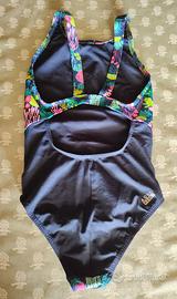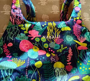 Costume intero marca NABAIJI, taglia 8-9 anni, tinta blu scuro con fantasia di creature marine sui toni del fucsia, giallo-verde e tiffany.