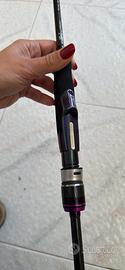 Nella parte bassa del blank i tecnici giapponesi hanno rinforzato il carbonio utilizzando un carbonio intrecciato che senza appesantire la canna le dona una robustezza maggiore mantenendo un azione regolare.