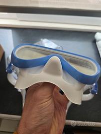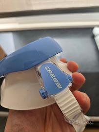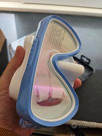 Colore lente: bianco / lilla Colore maschera: bianco / blu Vestibilità specifica femminile: il telaio compatto e la geometria raffinata sono progettati per adattarsi a profili facciali più stretti, fornendo una tenuta sicura e confortevole ideale per le donne subacquee. Lente singola ultra chiara: il design della lente mono realizzato in vetro temperato ultra trasparente offre una visibilità luminosa e nitida con una maggiore trasmissione del colore e senza interruzioni visive. Ampio campo visivo: nonostante il suo volume interno ridotto, la maschera offre un'eccellente visibilità periferica e verso il basso, migliorando la consapevolezza e il comfort sott'acqua. Gonna in silicone morbido di alta qualità: il silicone di alta qualità si adatta naturalmente ai contorni del viso, creando una tenuta aderente e senza pressione che rimane confortevole durante le lunghe immersioni. Struttura in polimero durevole: la costruzione robusta mantiene l'integrità strutturale negli ambienti di acqua salata e garantisce prestazioni a lungo termine senza deformazioni. Fibbie regolabili micrometriche: le fibbie integrate nel telaio consentono regolazioni rapide e precise della cinghia, anche con i guanti, fornendo una vestibilità stabile e personalizzata.