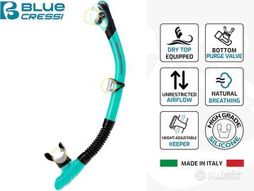 Snorkel caratterizzato da una speciale valvola nella parte superiore che sigilla il tubo quando è sommerso, impedendo l'ingresso dell'acqua,é dotato di un boccaglio in morbido silicone progettato per prevenire l'affaticamento della mascella, permettendo un uso prolungato e incorpora una valvola di spurgo nella parte inferiore per una facile espulsione dell'acqua.