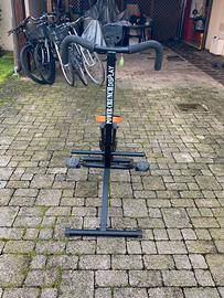 attrezzo per addominali tenuto bene, colore nero e arancione, dotato di display contaggio kcal e tempo di utilizzo. dotato anche di aste per aumentare la resistenza tramite dei dischi da palestra. sedile e manubrio regolabile. presenti pedaline in buona condizioni