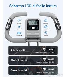 Sul display si può visualizzare timer, velocità, distanza, calorie e battito cardiaco che viene registrato appoggiando le mani al manubrio.
