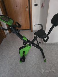 Cyclette Pieghevole in Acciaio dotata di elastici per braccia e schermo. Porta tablet e cellulare, tiene traccia del battito cardiaco, velocità, distanza, tempo e calorie bruciate. Seggiolino imbottito.