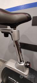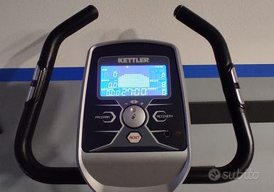 Cyclette Kettler modello Esprit D, attrezzo di alta qualità tedesca, solido e professionale. A differenza dei modelli base, questo modello dispone di regolazione dello sforzo elettronica gestita direttamente dal computer di bordo. Caratteristiche Principali: Regolazione Digitale dello Sforzo: Lo sforzo si imposta comodamente tramite i tasti "SET" (+/-) sul display, permettendo cambi di intensità precisi e fluidi durante l'allenamento. Volano da 8 kg: Garantisce una pedalata fluida, silenziosa e naturale, ideale per non affaticare le articolazioni. Computer di bordo LCD: Visualizzazione chiara di tempo, distanza, velocità, RPM, calorie e frequenza cardiaca. Rilevazione Cardio: Sensori "Hand Pulse" integrati nel manubrio. Regolazioni Personalizzate: Sella regolabile in altezza e profondità; manubrio inclinabile per una postura perfetta. Qualità Kettler: Telaio robusto in acciaio, stabile anche durante sforzi intensi La cyclette è perfettamente funzionante.