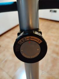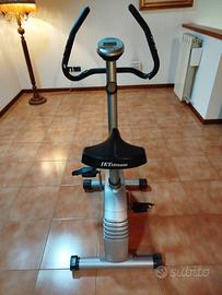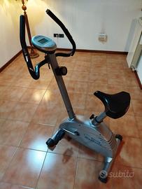 Cyclette con manubrio provvisto di computer, sensori di pulsazioni, misurazione calorie ed altro, resistenza pedalata regolabile e sella comoda.
