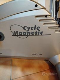Cyclette con manubrio provvisto di computer, sensori di pulsazioni, misurazione calorie ed altro, resistenza pedalata regolabile e sella comoda.