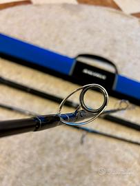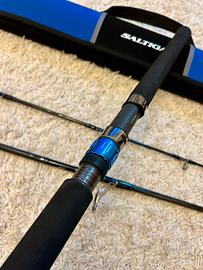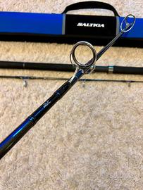Daiwa Saltiga airportable 80H, canna top di gamma per la pesca al tonno, casting weight 30-120 g, lunghezza 2.44 m, ingombro 92 cm, peso 464 g, PE 4-6, pochissime uscite quasi esclusivamente da riva con nessuna cattura (acquistata per gestire grosse stick con leccia amia), lievissima ossidazione sotto gli anelli come da foto, sempre accuratamente lavata dopo ogni uscita, condizioni pari al nuovo. Prezzo non trattabile, astenersi perditempo!