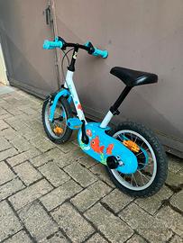 Bicicletta per bambini B'Twin 14" Aqua di Decathlon, ideale per bimbi dai 3 ai 5 anni (altezza consigliata 90-105 cm). La bici è perfetta per imparare a pedalare in sicurezza e divertimento.