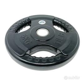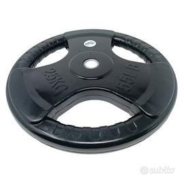 Abbiamo a disposizione dischi gommati con maniglie nelle taglie di peso 1.25, 2.5, 5, 10, 15, 20, 25 kg, foro 28 o 50 mm. Pesi con impugnatura tri-grip di qualità professionale per palestra. Ottimo prezzo.