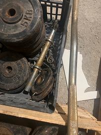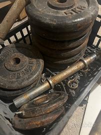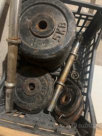12 pezzi da 5 kg 2 pezzi da 10 kg 4 pz da 2 kg 2 pz da 1 kg 2 manubri 1 bilanciere retto 1 bilanciere curvo Molle blocca peso
