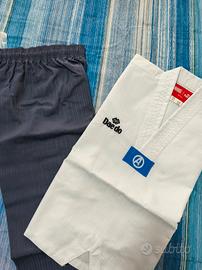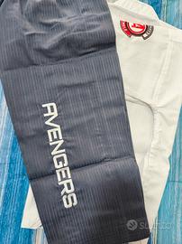 Dobok per Taekwondo marchio DAEDO personalizzato Marvel. Realizzato in una composizione di 20% cotone e 80% poliestere, con un tessuto leggero e confortevole. È composto da una giacca e da un pantalone grigio con un comodo elastico in vita. Personalizzato Avengers come da patch in foto. Taglia 100