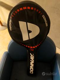Rarissimo fodero Donnay Borg Pro- interno velluto rosso -scritte bianco/arancio - cerniera loggata. Grafica esterna: Scritta Donnay in bianco e logo Borg Pro in arancio/rosso. Le scritte sono nitide,sature e perfettamente leggibili,senza sbiadimenti. Esterno: Pelle nera di alta qualità,integra, morbida e senza alcuna screpolatura. Interno: Rivestimento di lusso in velluto rosso intenso, perfettamente conservato. Questo interno "Premium"era studiato per proteggere il legno dai cambiamenti di umidità. Cerniera: Cursore originale con marchio Donnay in rilievo, perfettamente funzionante e fluido. Condizioni: Oggetto in stato eccellente,privo di odori e conservato professionalmente. Un accessorio indispensabile per chi possiede la racchetta Borg Pro e vuole completare il set con il fodero originale più bello e raro mai prodotto.