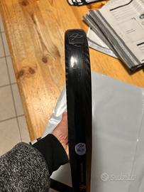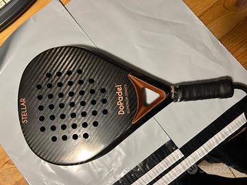 Pala racchetta da padel Dopadel stellar, pala con i piatti senza alcuna crepa/rottura o segno, come si vede da foto nella parte alta manca la vernice che è venuta via togliendo il doppio protettore, comunque la struttura non è intaccata in alcun modo, se necessiario disponibile all’invio di ulteriori foto