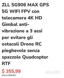 drone quadricottero zll 906 max, vendo causa inutilizzo, usato una sola volta per verificare la funzionalità. Ottimo per chi si avvicina al mondo dei droni , WiFi 5 g 4k con rilevatore di ostacoli, doppia batteria (una costa 65€), manuale e scheda descrizione nella scatola, ma anche sul web con video tutorial sono disponibili. possibilità di registrare sia su telefono che scheda TF non inclusa. molto potente e veloce oltre 1 km. prezzo poco trattabile. no spedizione no perditempo consegna a mano. vero affare. cambio con metal detector di pari valore. solo per il mese di dicembre a 199€