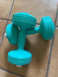 Due pesi per ginnastica, circa un kilo l'uno se riempiti con acqua, colore verde, dimensioni 25x11x11. Salvietta con sacchettino. Polsino in spugna.
