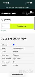 Vendo matassa di corde Dunlop ATP Tour Explosive Speed da 200 metri, calibro 1.25 mm (17g). Corda monofilamento in poliestere Ideale per giocatori che cercano una corda performante per un gioco moderno e aggressivo. Con una matassa da 200m è possibile effettuare circa 16-18 incordature (in base al telaio). Condizioni: Tutti i 200 metri disponibili, non ho usato neanche un centimetro👌🏻