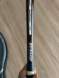 Vendo racchetta da tennis Dunlop Laser 316 in condizioni buone! Un pezzo vintage iconico, perfetto per collezionisti o per chi cerca una racchetta con carattere. > Caratteristiche: > * Modello: Dunlop Laser 316 > * Stile: Vintage > * Condizioni: Buona (v. foto) - conservata con cura. > * Incordatura: Viola vibrante, appena rifatta e pronta all'uso! > * Grip: Nero, in buone condizioni, morbido e antiscivolo. > * Copri-racchetta: Incluso! Originale e coordinato, protegge la racchetta con stile. > La racchetta presenta una particolare finitura spruzzata sui toni del viola e dell'arancione che la rende unica nel suo genere. La sua maneggevolezza e il suo design retrò la rendono ideale per gli amanti del tennis d'epoca. > Non perdere l'occasione di possedere un pezzo di storia del tennis!