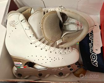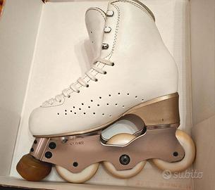 Pattini professionali per pattinaggio artistico Edea Ritmo in linea misura 225 con telaio Roll-Line, ruote cambiate da poco e cuscinetti in perfetto stato. Usati dalle mie due figlie, presentano piccoli segni sulla scarpa, appena visibili; i freni come da foto sono usurati ma ancora validi.