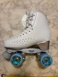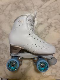 Pattini Edea Ritmo n 250 con piastra Variant e ruote Giotto blu usati poco per passaggio al ghiaccio, preferibile ritiro su Milano per visione del pattino.