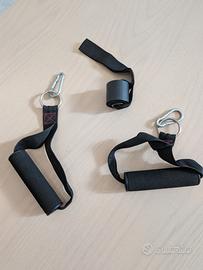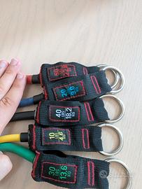 Elastici per esercizio fisico a casa, molto utili per chi deve fare esercizi di fisioterapia. Diversi livelli di resistenza. Sono presenti due maniglie da agganciare e un blocco da inserire eventualmente sulla porta. Compresa nel prezzo sacchetto contenitore.