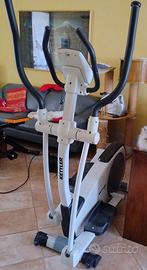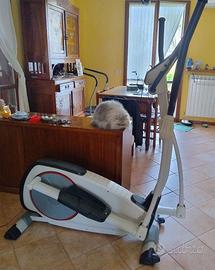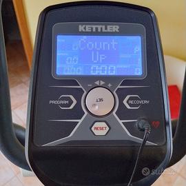 L'ellittica Kettler Rivo P ha : -volano da 14 kg, per un movimento fluido e naturale -resistenza elettromagnetica è regolabile tramite gli appositi pulsanti della console su 16 livelli di sforzo -display retroilluminato che permette di tenere sotto controllo , tempo, distanza percorsa, stima delle calorie bruciate, livello di resistenza e pulsazioni. -programmi preimpostati oppure svolgere un programma manuale libero -rilevara il battito cardiaco mediante i sensori Hand Grip posti sul manubrio (da rivedere i collegamenti elettrici,credo di aver sbagliato qlc nei collegamenti), con ear clip sesor, o fascia (non inclusa). Attrezzo sposabile tramite le ruote nella base. Utilizzata poche volte, perfettamente funzionante