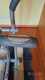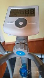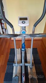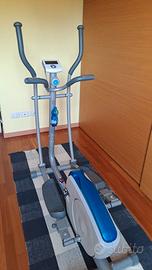 Elittica marca Domyos, con varie selezioni di sforzo e sensori sul manubrio per il costante monitoraggio del battito cardiaco.