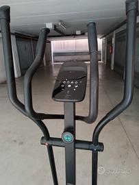 Ellittica Domyos con manuale, usata ma in buonissime condizioni, facilmente spostabile grazie alle routine anteriori,con possibilità di collegarla via bluetooth ad applicazione su smartphone o tablet, posizionabile sopra la consolle (nella foto il fumetto), dotata di alimentatore, manca il cardiofrequenzimetro analogico(si è rotto subito) ma non serve per il normale utilizzo, in quanto le manopole centrali registrano il battito cardiaco, sulla foto del manuale trovate dimensioni e peso dell'attrezzo.