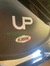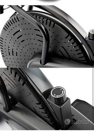 Trainer aerobico a basso impatto su ginocchia caviglie e colonna vertebrale. Allena arti superiori e arti inferiori. Computer display Lcd: tempo, velocità, distanza, calorie. Manopola per la regolazione micrometrica dello sforzo. Telaio in acciaio con ruote x spostarla. Dimensioni: cm.110x50x155h. Peso kg.23