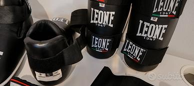 Equipaggiamento protettivo da ragazzo marca Leone, il kit comprende: -Para tibia - Para piedi - Pantaloni - Conchigliera