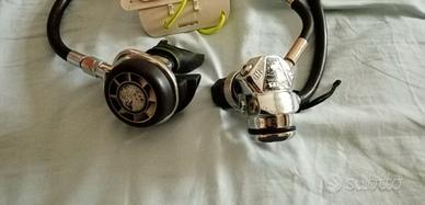 Vendo erogatore Mares Abyss bonificato ossigeno con manometro per bombola decompressiva, manometro BTS cassa acciaio con frusta corta e tavoletta piano decompressivo da polso