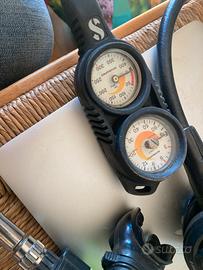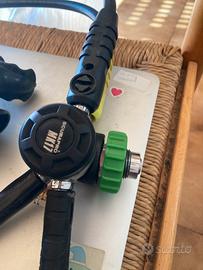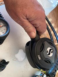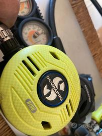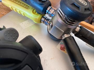 Erogatore Scubapro MK17 (primo stadio) a membrana connessione DIN perfetto per acque fredde o non limpide. Secondi stadi Scubapro R555 e R190. Consolle Scubapro con manometro e profondimetro. Revisionato e pronto ad entrare in acqua.