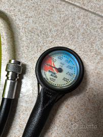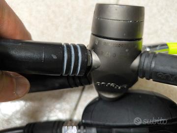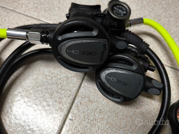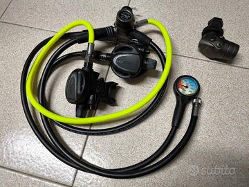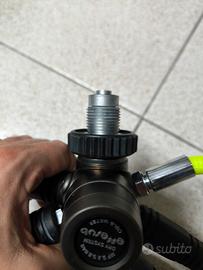 Erogatori Octopus Effesub, un primo stadio con attacco DIN 300 bar, due secondi stadi Effesub HD330 e manometro Seac. Possibilità di acquisto (a richiesta e non compreso nel prezzo) di un altro primo stadio gemello, mai entrato in acqua, per configurare il tutto in modalità Tek.
