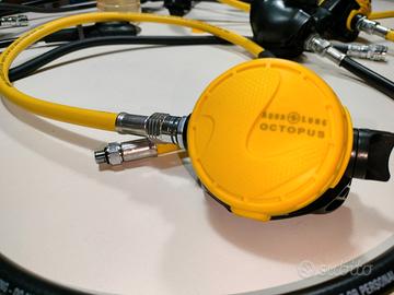 Vendo come da foto erogatore completo octopus Aqualung Calypso usati poco. 10 immersioni. Comprende 1 primo stadio con attacco DIN - 2 Erogatori di cui uno con frusta gialla per emergenza, un manometro mares - una frusta bassa pressione. Il prezzo si intende per 1 set completo usato. Si consiglia revisione.