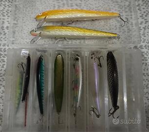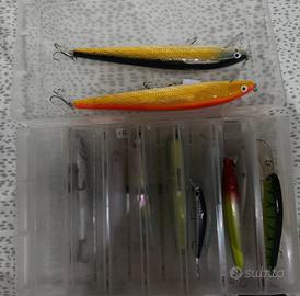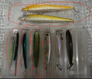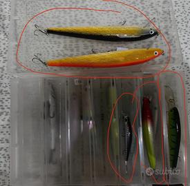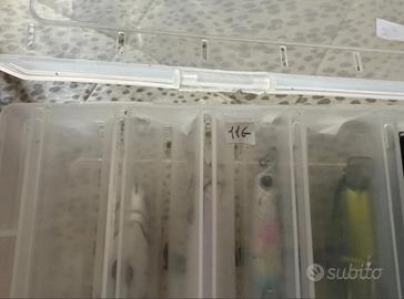 Vendo esche vari tipi e grammi…..porta esche caperlan si e rotto il gancio di un solo lato come si vede dalle foto però non incide sulla sua funzionalità, esche cerchiate di colore sono nuovi invece il restante usati……prezzo 35 euro….per chi non fosse interessato passate ad altro grazie!! Posso anche spedire