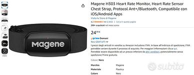 vendo: fascia cardio Magene H303 nuova con imballo e libretto istruzione a 13 euro caratteristiche: Nuovo Design: con un circuito di elaborazione ECG avanzato, l'H303 estrae i dati della frequenza cardiaca direttamente dalla curva ECG. Emetti i dati sulla frequenza cardiaca più accurati attraverso l'algoritmo di ricerca ed elimina le interferenze causate dal movimento e dalla sudorazione. L'hardware e gli algoritmi di nuova concezione ti aiutano a monitorare con precisione la frequenza cardiaca durante l'allenamento e a massimizzare i risultati dell'allenamento Promemoria con luce LED: H303 ha una luce LED lampeggiante che conferma la frequenza cardiaca e la connessione, consentendoti di rimanere facilmente concentrato e migliorare l'efficienza durante qualsiasi attività o esercizio. Dopo che il sensore è stato indossato correttamente, si accenderà automaticamente, il LED anteriore lampeggia (si spegne dopo 10 volte). *Nota: la luce rossa indica che il monitor è pronto per l'uso Compatibile ANT+ e Bluetooth: 2 copie di dati per 1 allenamento, registrazione tramite dispositivo ANT+ e app Bluetooth contemporaneamente, con trasmissione stabile. ANT+: Magene, Wahoo, IGPSPORT, Bryton, Black Bird. Bluetooth: Zwift, Onelap, Strava, Kinomap, Wahoo Fitness, TrainerRoad, Rouvy, Fulgaz, Nike Run Club, Openrider, Elite HRV Versatilità: realizzato con materiali durevoli e resistenti all'usura che non si rompono o si strappano. Resistenza all'acqua IP67 ma non per il nuoto. Il cardiofrequenzimetro Magene H303 può essere utilizzato in quasi tutti gli sport come ciclismo, fitness, calcio, tennis, corsa, basket, ecc Durata della Batteria: dura 1000 ore, 1 ora al giorno, 4 volte alla settimana, 2,5 anni di tempo di lavoro. consegna SOLO a mano-NON spedisco