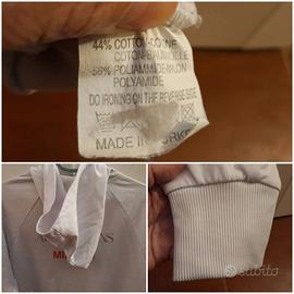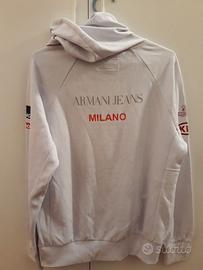 Felpa con cappuccio leggera in tessuto misto cotone dell'Armani Jeans Milano marca Kronos made in Turchia, tg XL (ascella 56 cm circa; altezza 66 cm circa; lunghezza maniche da polsino ad attaccatura colletto 78 cm circa). IL CAPPUCCIO È MANCANTE DEL LACCIO PERCLA REGOLAZIONE (VEDASI DETTAGLI FOTO) E IN ALCUNE ZONE DEL TESSUTO SONO PRESENTI DEI LIEVI SEGNI DI SPORCO CHE CON IL LAVAGGIO DOVREBBERO ANDAR VIA TRANQUILLAMENTE. Le scrittecsu entrambe le spalle e maniche sono termoapplicate; la scritta dello sponsor tecnico davanti è floccata in rilievo in vellutino grigio. Le scritte sulla schiena sono termoapplicate. Presenta tasche laterali chiuse con cerniera. Articolo poco usato in ottimo stato generale e ben conservato.