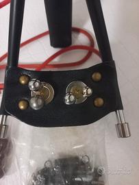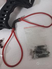 fionda fornita con svariati pezzi. - Struttura in polimero e metallo - poggia braccio con basi magnetiche per munizioni - Inclusi 2 elastici - Set di sfere d'argilla - Pezzi di ricambio inclusi - Chiavi esagonali per smontaggio e rimontaggio incluse.