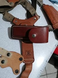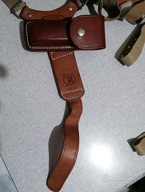 Bella e comoda fondina ascellare in pelle con porta caricatore e tre inserti diversi per agganci. Marca R Holster 99/02.