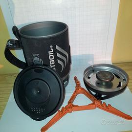 Fornello jetboil , il modello più piccolo, ideale per trekking, usato un paio di volte, come nuovo, in perfette condizioni, completo di tazza , bruciatore, coperchio, coperchio di base e piedini per bomboletta, vendo ad euro 50 non trattabili.