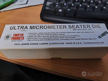 endo matrice mettipalla di alta precisione Forster Ultra™ Micrometer Seater Die per calibro .260 Rem (6.5-08). Il die è dotato di micrometro per la regolazione millimetrica della profondità di inserimento della palla e di camera flottante per un allineamento perfetto tra bossolo e proiettile. Prodotto "Made in U.S.A." in condizioni eccellenti e completo di scatola originale.