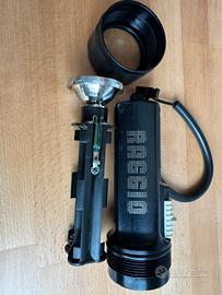 Ficile Mares modello Medistend con regolatore di potenza, il fucile necessita di revisione completa in quanto è inutilizzato da diversi anni. Insieme al fucile consegno serie dí fiocine, supporto per eventuale torcia da montare sotto, torcia Technisub modello Raggio che può funzionare con 4 oppure 8 batterie stilo, lampada a incandescenza, custodia in neoprene a protezione del fusto, serie di anelli e ogiva di ricambio pallone da sub e coltello con lama lunga 17cm. Prezzo non trattabile