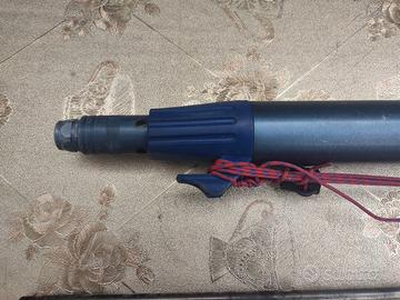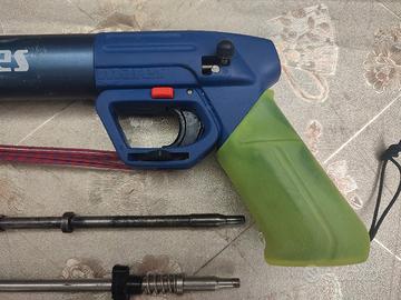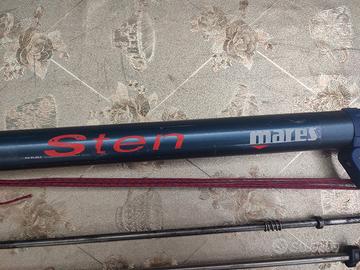 fucile sub Mares MidiSten 70 con regolatore pressione, completo di pompa gonfiaggio, tre aste di cui due in acciaio, arpione, cinquepunte Omer, manico rivestito con silicone giallo .