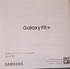 "Galaxy Fit - e" della Samsug con caricabatteria e guida rapida di riferimento. La connessione del Fit ad un dispositivo mobile avviene dopo aver scaricato l'app Galaxy Wearable. Buone