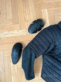 Gambeson imbottito per scherma storica / HEMA (Historical European Martial Arts), con protezioni rigide removibili per spalle e gomiti/avambracci, inserti traspiranti su schiena e avambracci e cinghia posteriore per regolazione larghezza. Resistenza al perforamento 800 Newton, certificato per sparring. Taglia L. Usato molto poco, eccellenti condizioni.