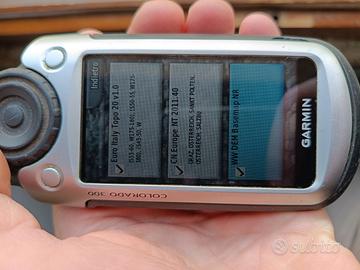 Garmin Colorado 300 in discrete condizioni, con visibili segni di usura ma perfettamente funzionante, con schermo a colori leggibile, bussola elettronica, altimetro barometrico, termometro e navigazione GPS precisa e affidabile, ideale per escursionismo e tutte le attività all'aperto. Con accessori per il trasporto e scheda con mappe.